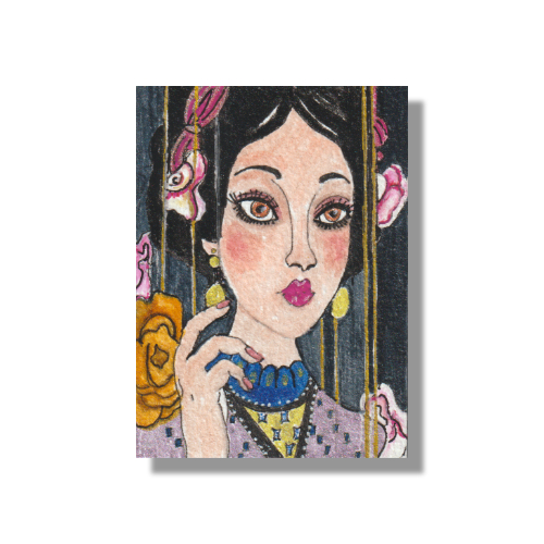Mixed media painting on 3.5 x 2.5 inch Arches 140 lb, archival, 100% cotton paper